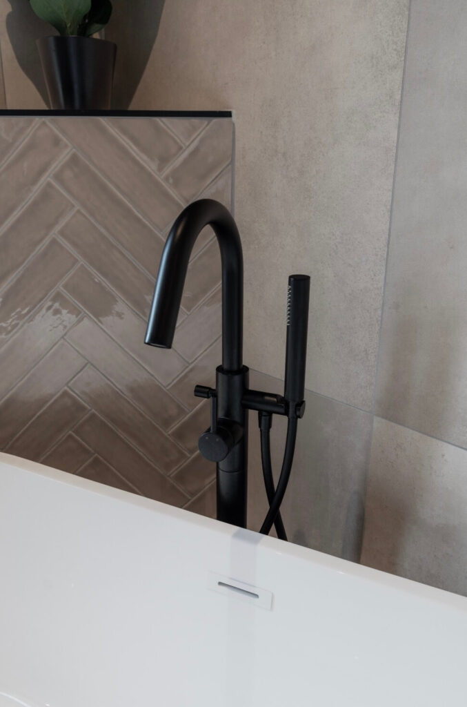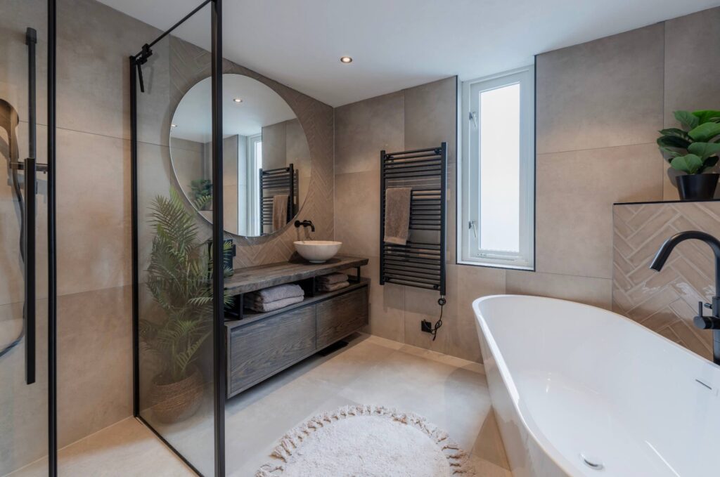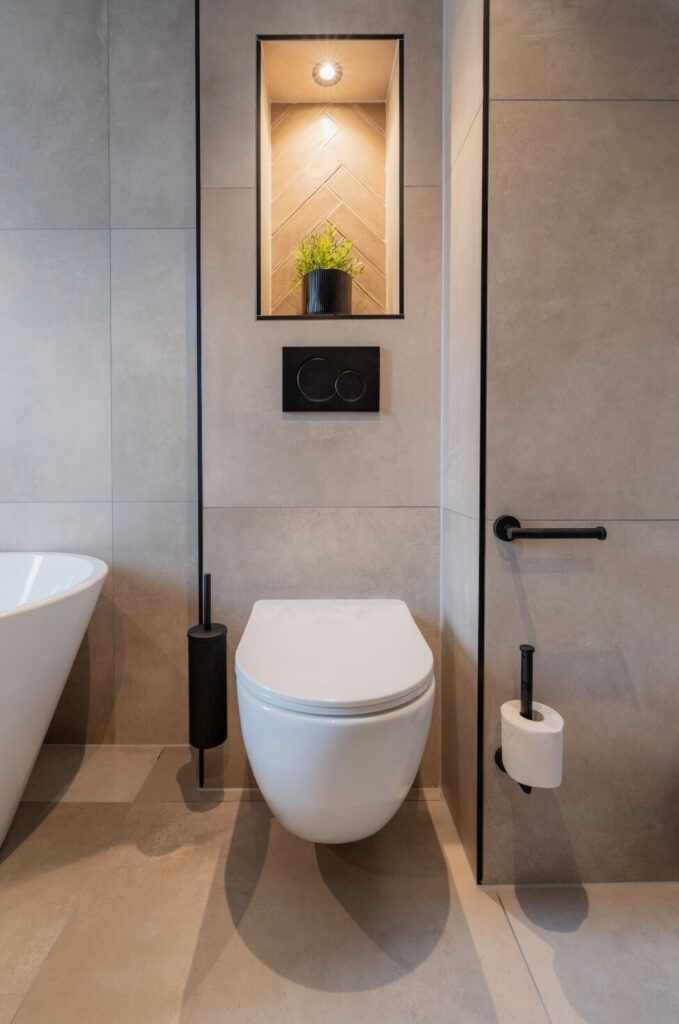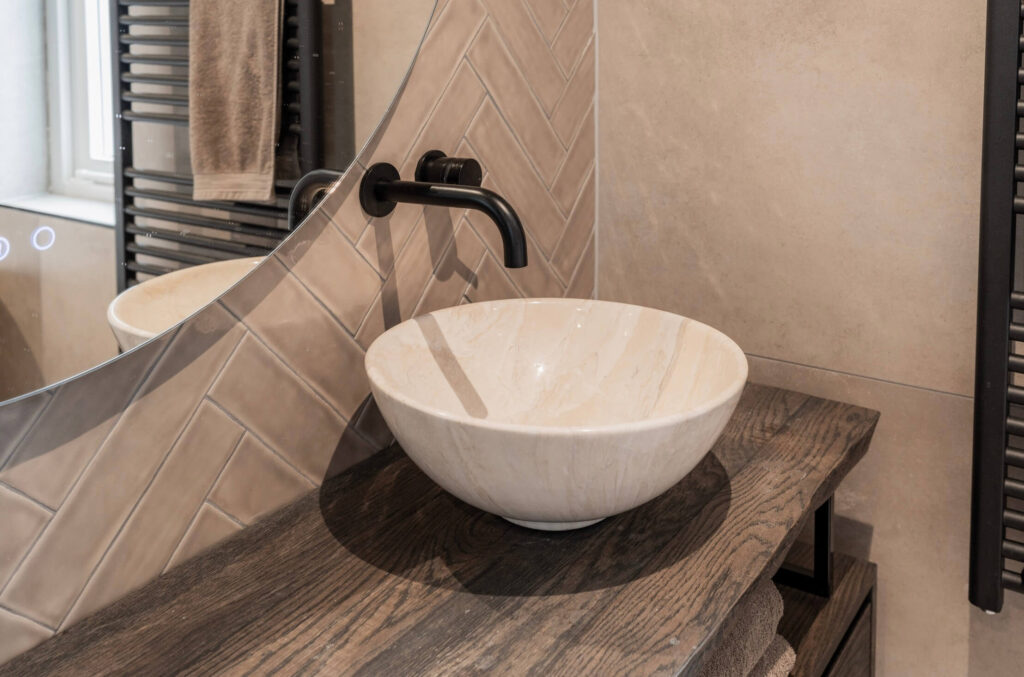 Ze hebben gekozen voor natuurlijke materialen en zachte aartse kleuren. Dit hebben ze gecombineerd met inbouwkranen, een regendouche en mooie nisjes met een visgraat tegel.