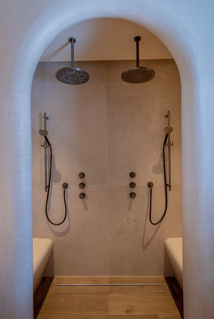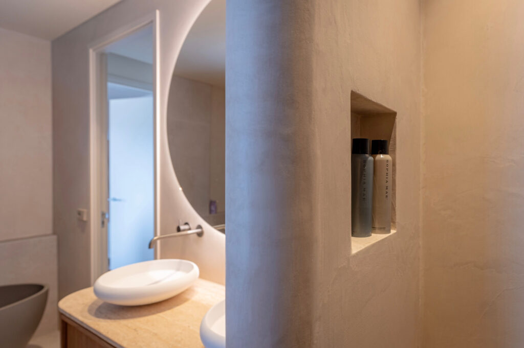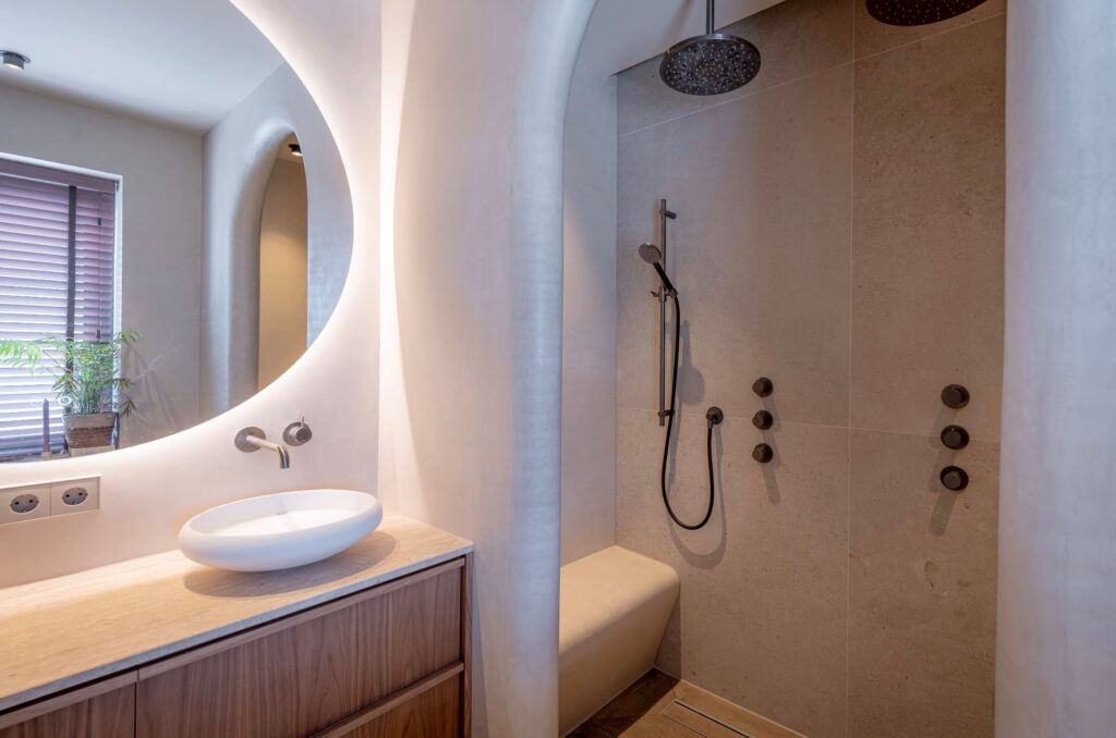 Een prachtige japandi badkamer, geleverd en geplaatst door Abedini en partners. De klant is bij Abedini gekomen met een specifiek wensenpakket. De offerte bestond uit een maatwerk badmeubel, luxe Hotbath inbouwkranen, een dubbele douche en een prachtig vrijstaand bad. Dit wilde de klant ook graag geinstalleerd hebben door een aannemer, inclusief al het stucadoorswerk met prachtige ronde vormen.